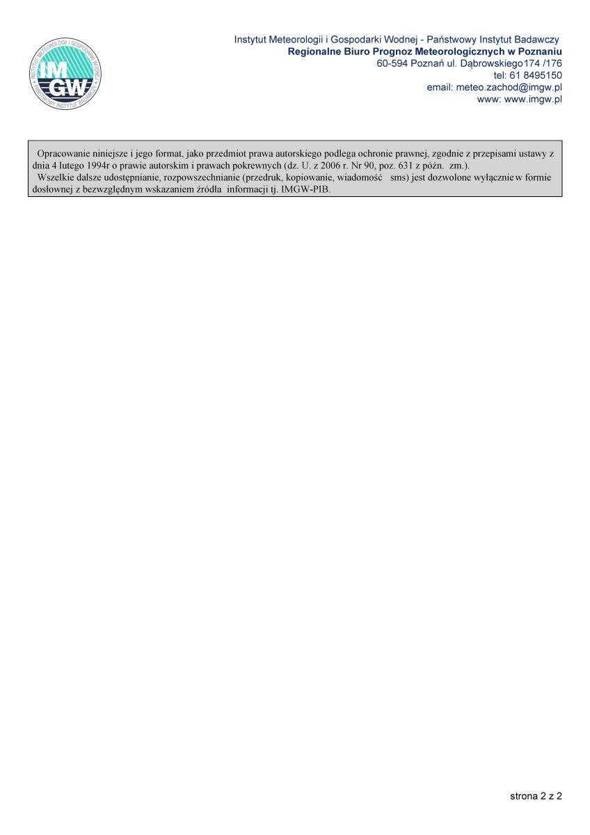 Miejscami wilgotne i mokre nawierzchnie dróg i chodników po opadach deszczu ze śniegiem i mokrego śniegu będą ulegać zamarzaniu i oblodzeniu. Temperatura minimalna od -4°C do -1°C, przy gruncie od -6°C do -3°C. Miejscami ujemna temperatura powietrza utrzyma się również w ciągu dnia 03.01.