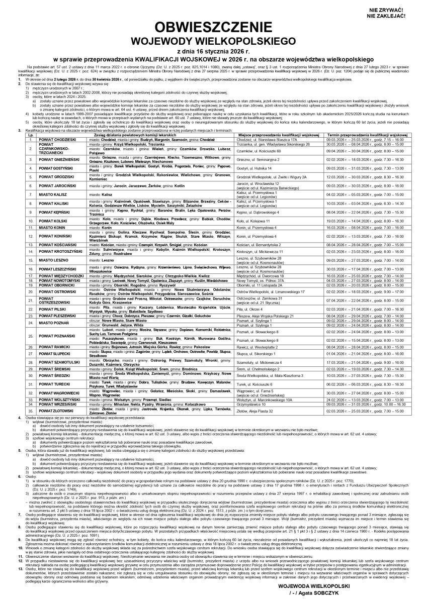 OBWIESZCZENIE WOJEWODY WIELKOPOLSKIEGO z dnia 16 stycznia 2026 r. w sprawie przeprowadzenia KWALIFIKACJI WOJSKOWEJ w 2026 r. na obszarze województwa wielkopolskiego