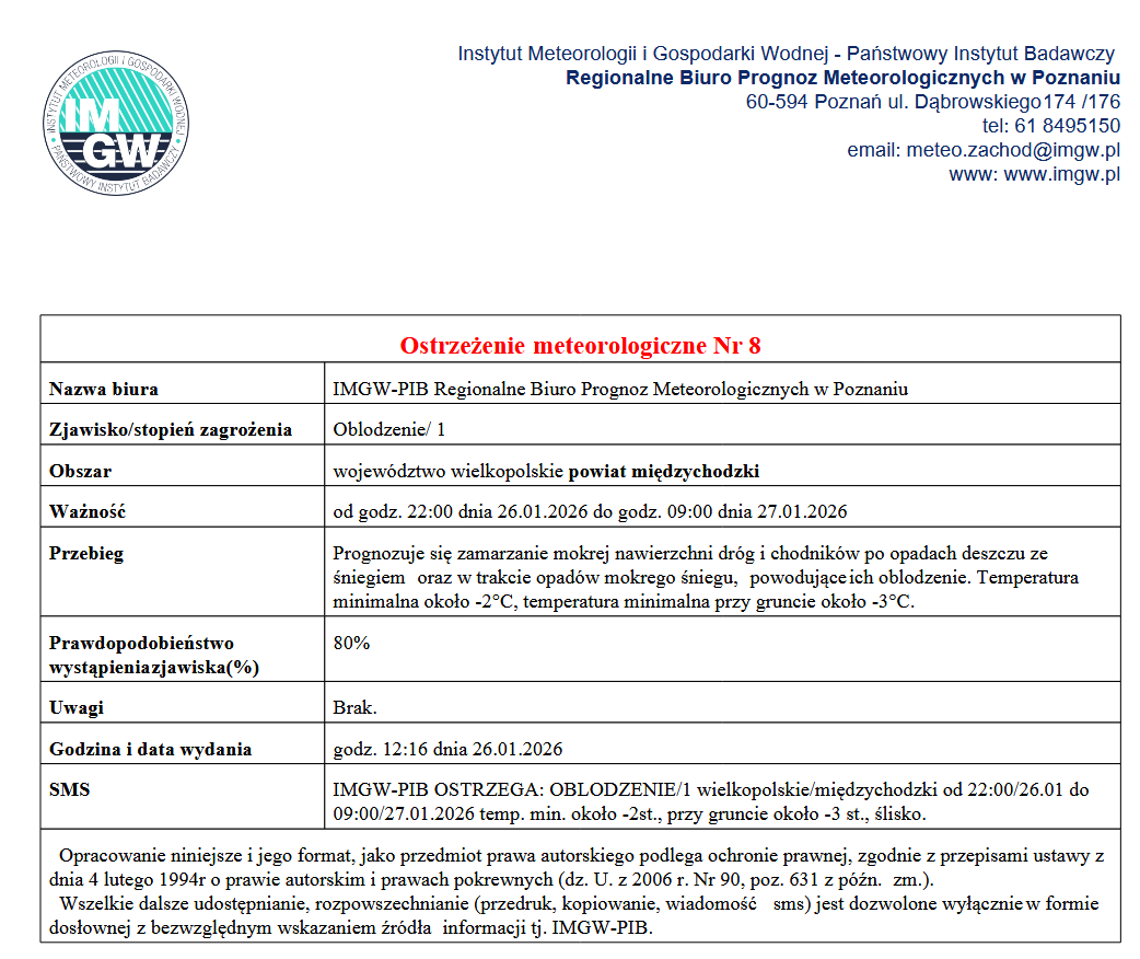 MGW-PIB OSTRZEGA: OBLODZENIE od godz. 22:00 dnia 26.01.2026 do godz. 09:00 dnia 27.01.2026 - województwo wielkopolskie powiat międzychodzki