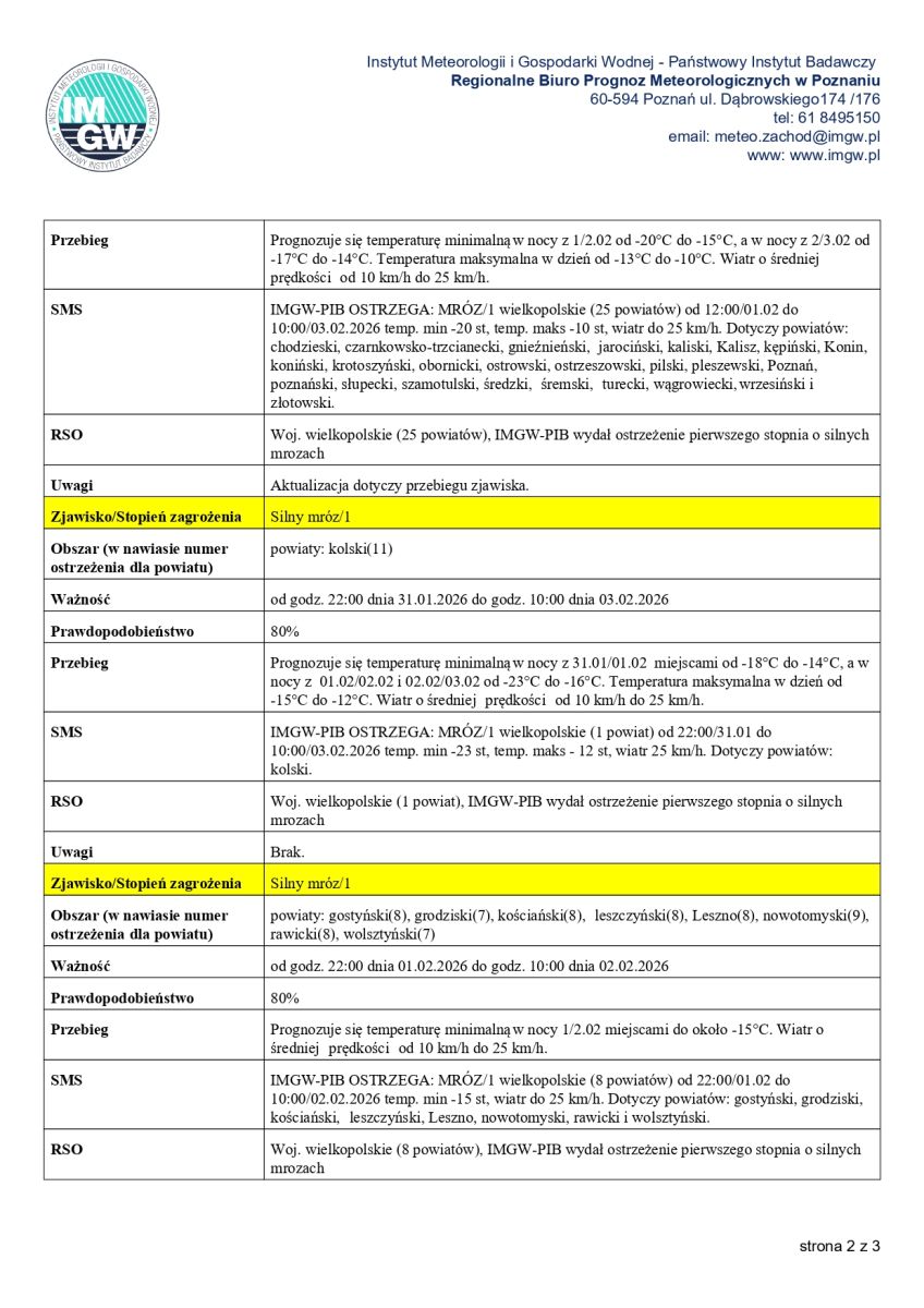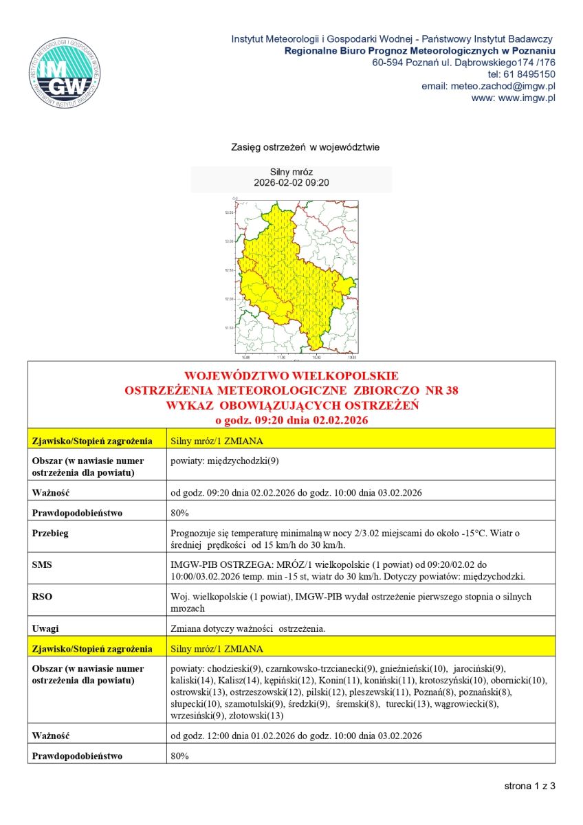 MGW-PIB OSTRZEGA: MRÓZ/1 od 09:20/02.02 do 10:00/03.02.2026 temp. min -15 st, wiatr do 30 km/h. Dotyczy powiatów: międzychodzki.